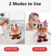 2.【Unique Design】— Dancing cow toy can move turn and left, and the arms swings up and down, even can even blink when moving. There are 2 modes for choose. You can choose the cattle to glow in a static state or dance to music and lights.